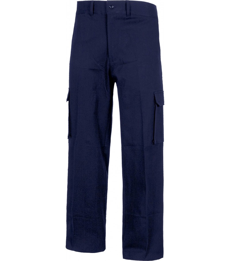 Dos bolsillos laterales de apertura inclinada en los costados, dos más de carga laterales con cartera y cierre de botón oculto, y otros dos traseros con cierre de botón.